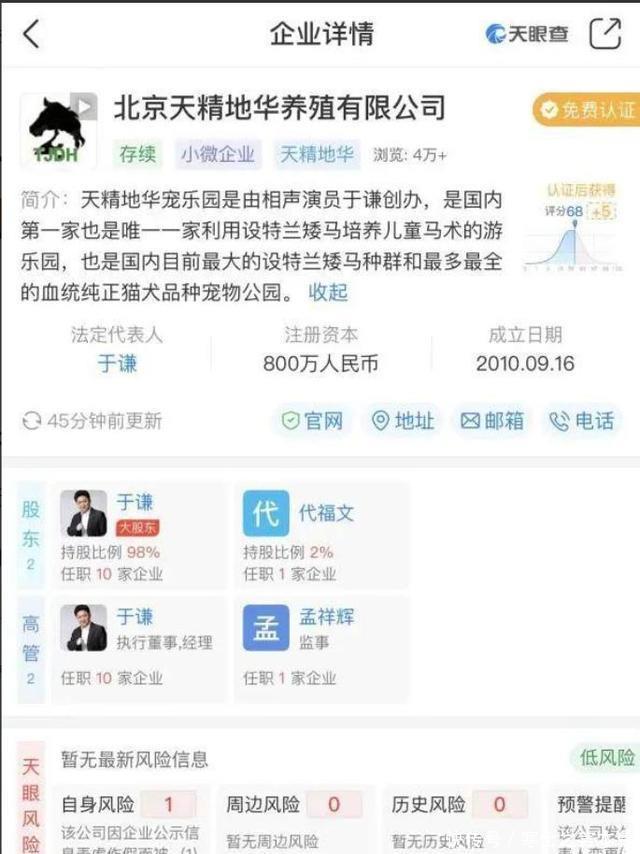 这种舆论反噬的力量是巨大的,很快一些“黑料”就被网友们扒了出来,很快于谦名下的另一家公司——天精地华宠乐园,就进入了大众视野, 这家公司曾因“通过登记的住所或经营场所无法联系”而被列入经营异常名录。